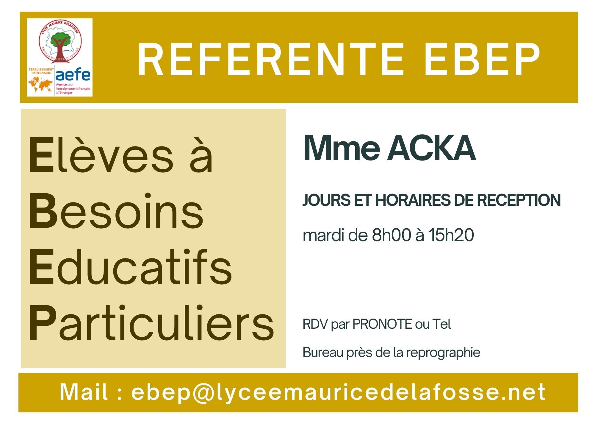 La Direction de l’Etablissement (Proviseur / Proviseure Adjointe) est détachée par le MEN.