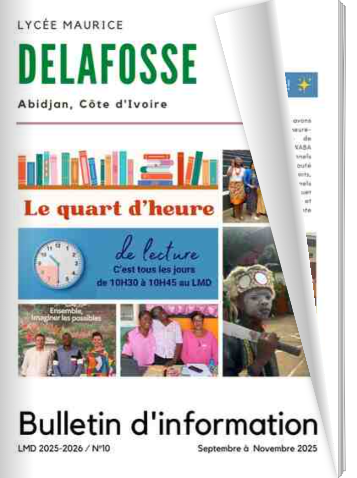 Nos élèves grandissent en confiance au LMD. Ils y sont progressivement responsabilisés et encouragés à s’impliquer dans la vie de l’établissement, à travers des actions éducatives et pédagogiques variées : projets citoyens, culturels, sportifs, actions de prévention et de bien-être, développement durable, clubs, concours, sorties et voyages scolaires… Nous accordons une place importante à la culture ivoirienne, afin de favoriser l’ouverture culturelle et le respect des valeurs locales, dans un esprit de dialogue et de vivre-ensemble.